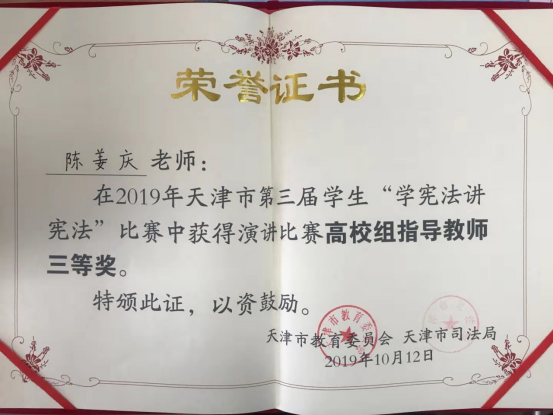 近日,由天津市教育委员会、天津市司法局主办,天津理工大学、天津广播电视台生活广播承办的天津市第三届员工“学宪法讲宪法”演讲比赛暨教育部第四届全国员工“学宪法讲宪法”活动天津赛区选拔赛举行。公司社科部陈姜庆老师获天津市第三届员工“学宪法讲宪法”比赛高校组指导教师三等奖。