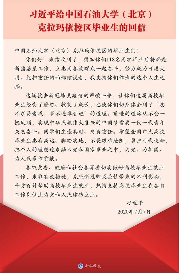 中共中央总书记、国家主席、中央军委主席习近平77日给中国石油大学(北京)克拉玛依校区毕业生回信,肯定他们到边疆基层工作的选择,对广大高校毕业生提出殷切期望。